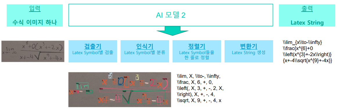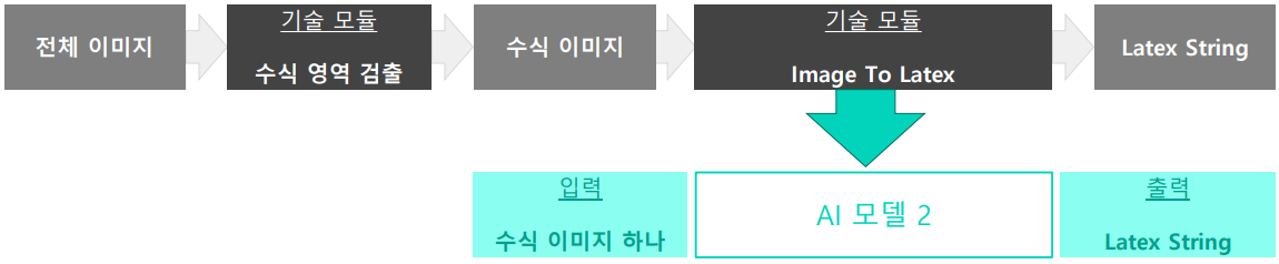 위의 대화를 종합하면, 아래 그림의 입출력을 갖는 Image to Latex기술 모듈이 필요함을 알 수 있다. 입력으로 수식 이미지가 들어가면 출력으로 Latex문법이 나온다.