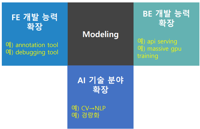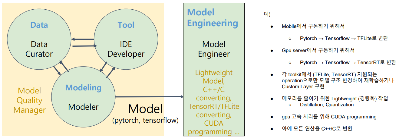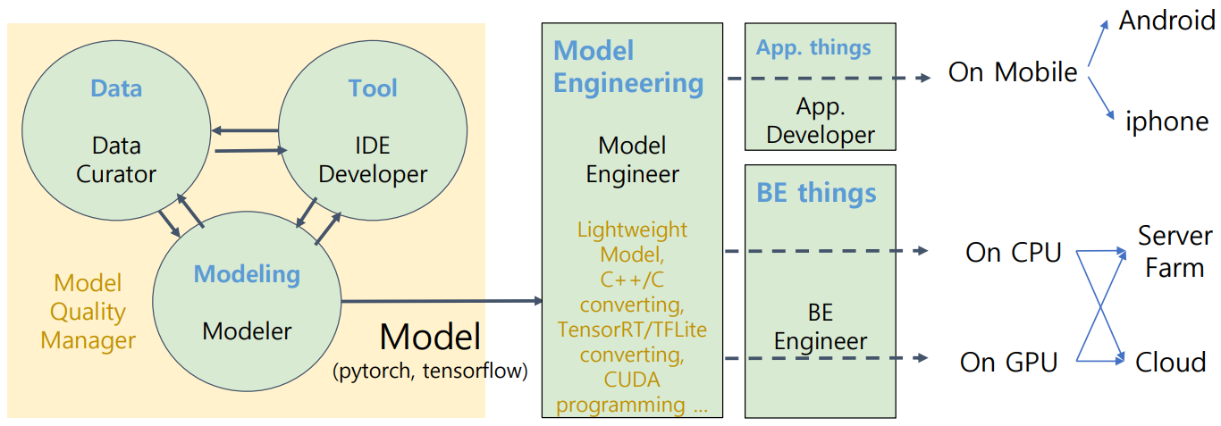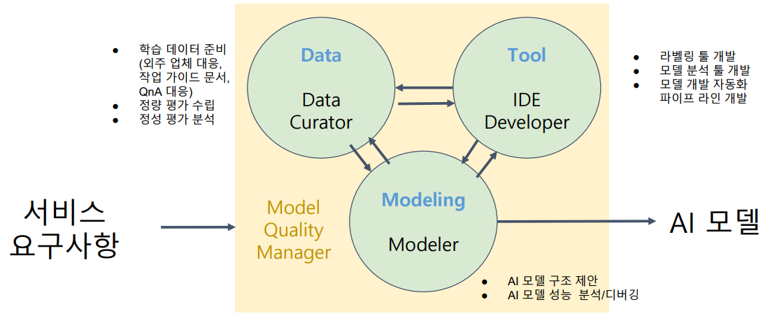 AI를 모델을 개발하는 Modeling 인력과 데이터 수집 및 품질관리를 하는 Data 인력과 Modeling/Data 업무의 효율성을 위한 Tool 인력이 필요하다.