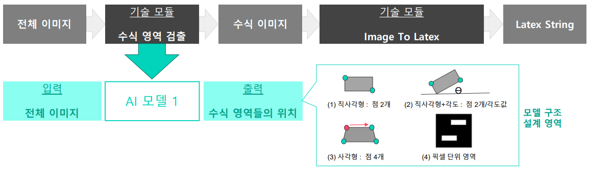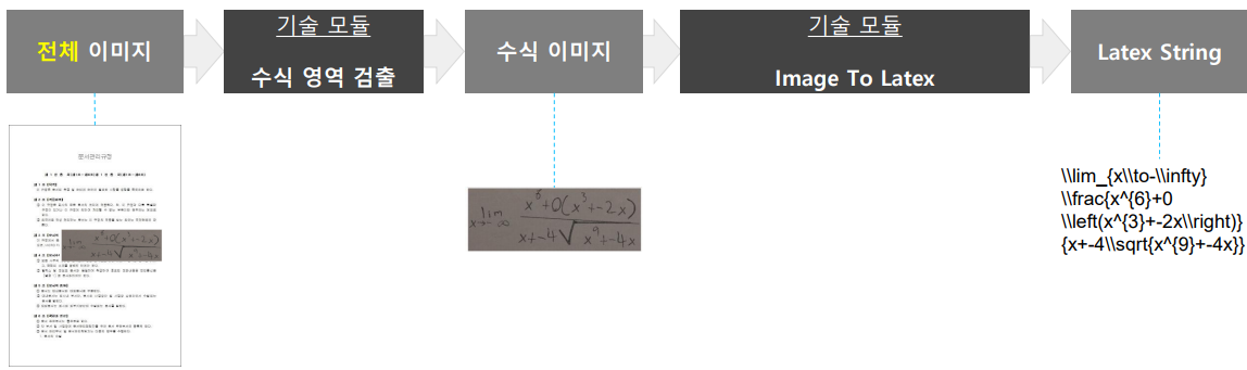 이 문제를 해결하기 위해서는 Image to Latex기술 모듈 앞단에 수식 영역을 검출하는 기술 모듈을 추가해야 한다.
