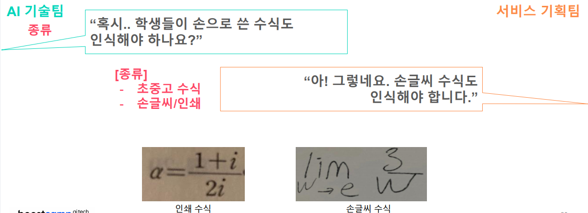 예를 들어, OCR기술을 활용하여 수식이미지를 Latex로 변환하는 서비스를 생각해보자. 서비스 기획팀과 커뮤니케이션하여 데이터셋의 종류 및 정답 등을 확정한다.