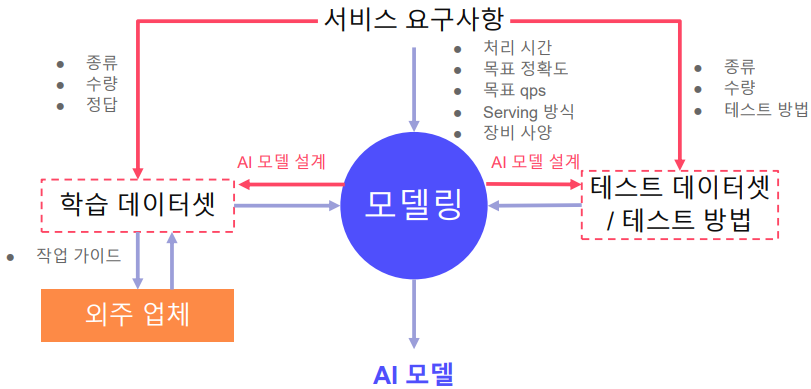학습 데이터셋 준비 담당자의 경우 하는 일은 아래와 같다. 외주 업체에 필요한 데이터 수집을 요구할 수도 있고, AI 모델 개발자와 학습데이터 형태와 모델 설계관련 논의할 수 있고, 서비스 기획자와 요구사항을 구체화하여 학습데이터 형태를 정할 수 있다.