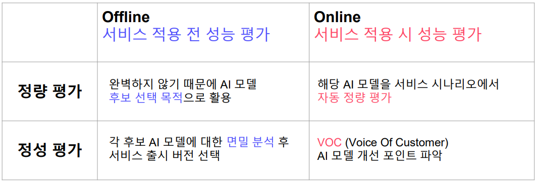 이렇듯 실 서비스 적용 전, 개발 환경에서의 정량 평가와 실 서비스에서의 정량평가 사이 Gap이 클 수 있다. 따라서 실 서비스의 평가 결과를 잘 설계하는 것이 중요하다. 평가 방식을 정할 때는 아래의 항목을 고려해보자.
