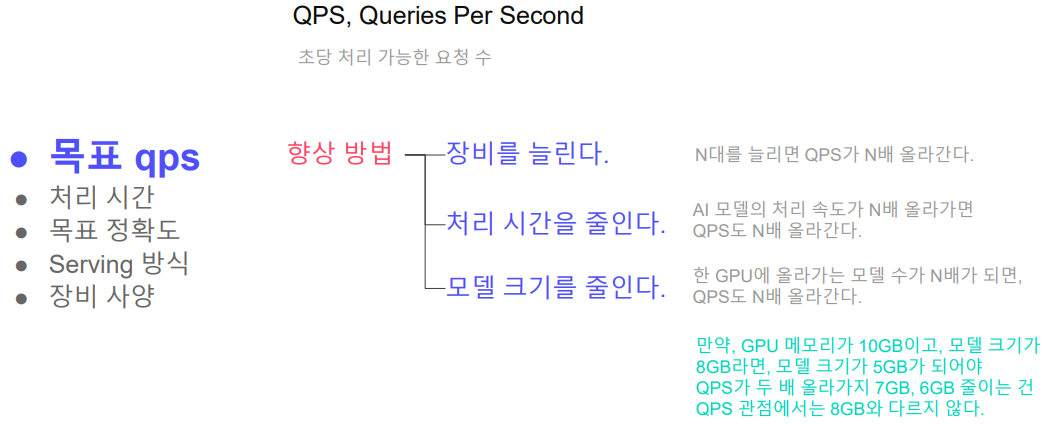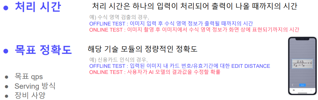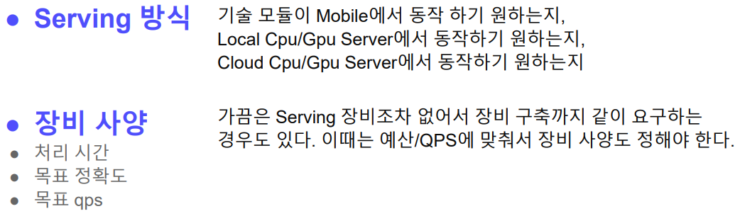 서비스 요구사항은 일반적으로 처리 시간, 목표 정확도, 목표 qps, Serving 방식, 장비 사양 등이 있다. 이 요구사항에 맞도록 서비스를 개발해야 한다.