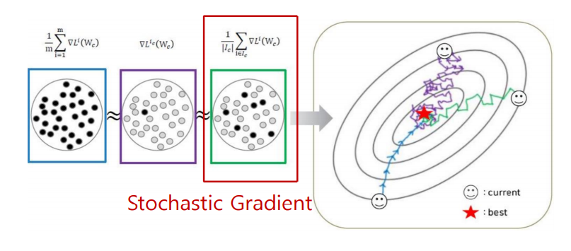 아래 그림에서 파란색은 모든 데이터를 입력하는 즉 full-batch로 학습하는 Gradient Descent(GD)이고, 보라색은 데이터를 나누어 입력하는 Stochastic Gradient Descent(SGD)에 해당하나 데이터를 1개씩 입력한다. 초록색은 mini-batch를 통해 적절한 데이터 개수를 랜덤으로 선별하여 입력하는 Stochastic Gradient Descent(SGD)이다. 화살표 오른쪽 그림의 경사 하강법을 통해 매개변수를 갱신해나가는 과정을 보면 full-batch를 이용한 GD(파란색)는 헤매지 않고 최적의 방법으로 ★best로 찾아가지만 mini-batch를 이용한 SGD(초록색)는 구불구불하게 약간 헤매면서 찾아간다. 그러나 속도는 SGD(초록색)가 GD(파란색)보다 훨씬 빠르다. 이를 통해 SGD는 최적의 방법으로 학습하진 않지만 GD의 속도 문제를 해결한 방법임을 알 수 있다.