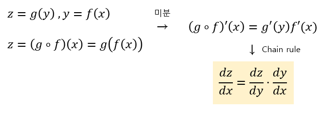 z함수를 x에 대해 미분한 결과는 z함수를 y에 대해 미분한 결과와 y함수를 x에 대해 미분한 결과를 곱하여 구할 수 있다는 것이 핵심이다.