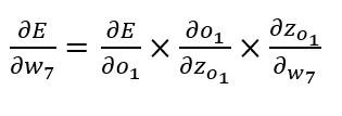 예를 들어, chain rule성질을 이용하여 손실 함수 E를 w7에 대해 미분을 하면 아래의 식과 같다.