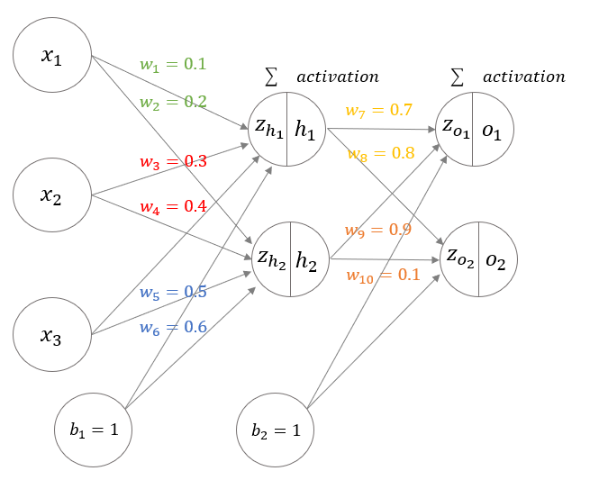 먼저 weight들의 초기값들로 forward pass를 한다. 그 후 backpropagation을 통해 손실 함수를 각 weight에 대해 미분한 값을 구하여 그 미분값과 learning rate와 minus부호를 곱하여 새로운 weight로 갱신한다.