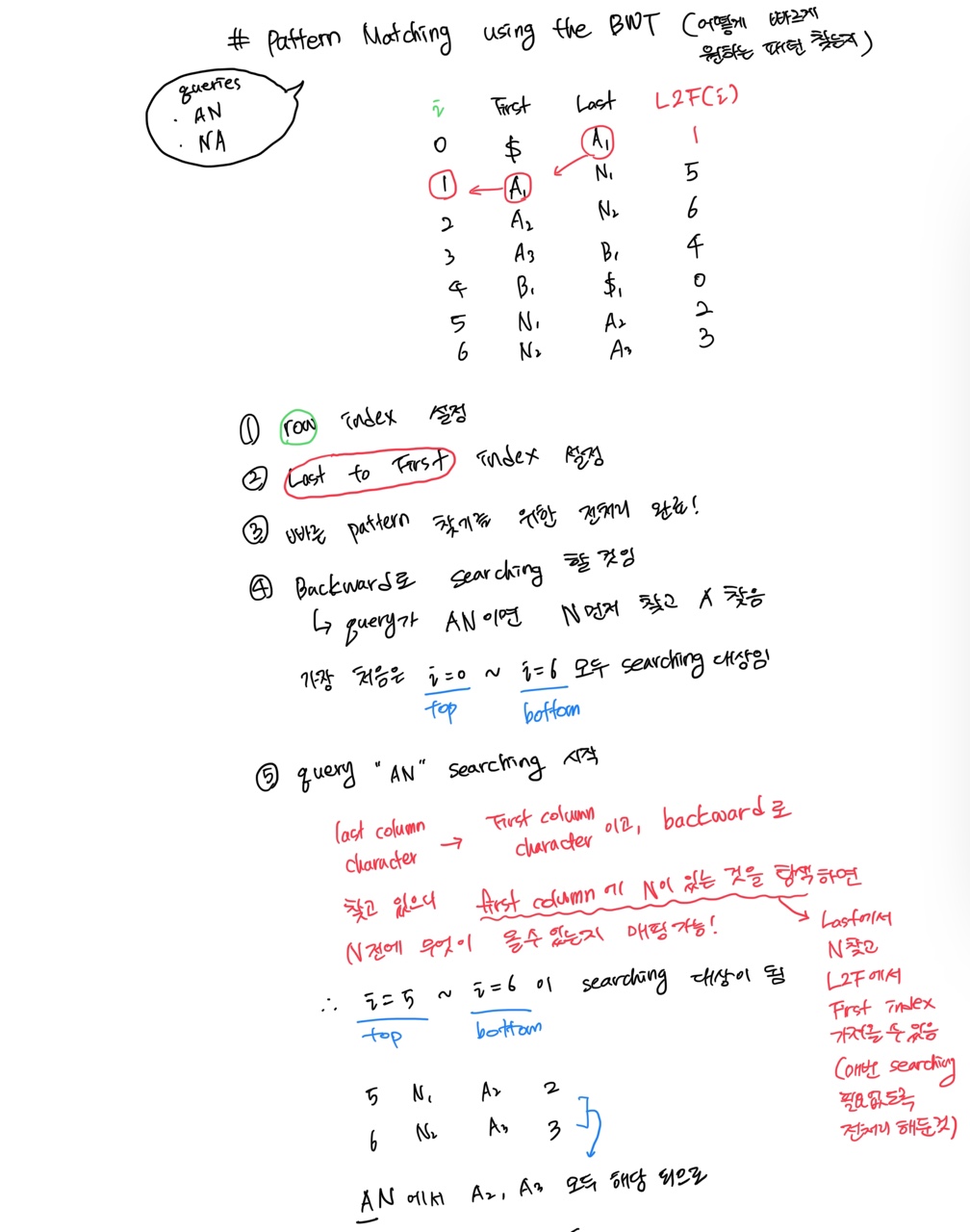 - 다음 마지막 column이 첫 column에 있는 인덱스를 표시하는 L2F(i)를 표시한다. 이것을 만드는 이유는 backward로 searching하기 때문이다.(e.g. query가 "AN"이라면 N부터 찾고 A를 찾는 방식) 어떻게 찾는지 보자!