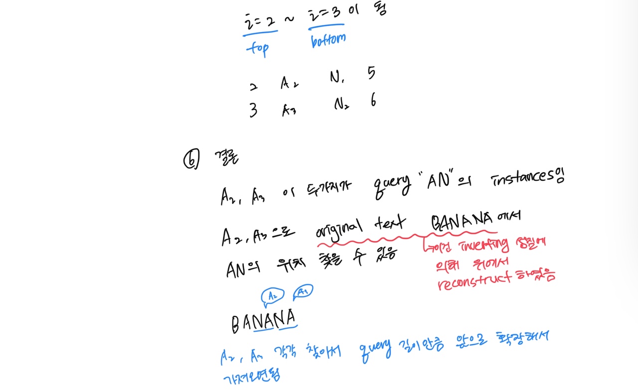- query "AN"에 대해 검색된 instances는 A2와 A3이다. 이 instances는 위에서 복구된 첫번째 row(database의 original text)와 매핑되어 있으므로 database내에서 위치를 찾아올 수 있다. 복구된 첫번째 rows는 $B1A3N2A2N1A1였다. A3을 시작으로 query length만큼 살펴보면 A3N2를 찾을 수 있고, 마찬가지로 A2를 시작으로 살펴보면 A2N1을 찾을 수 있다.