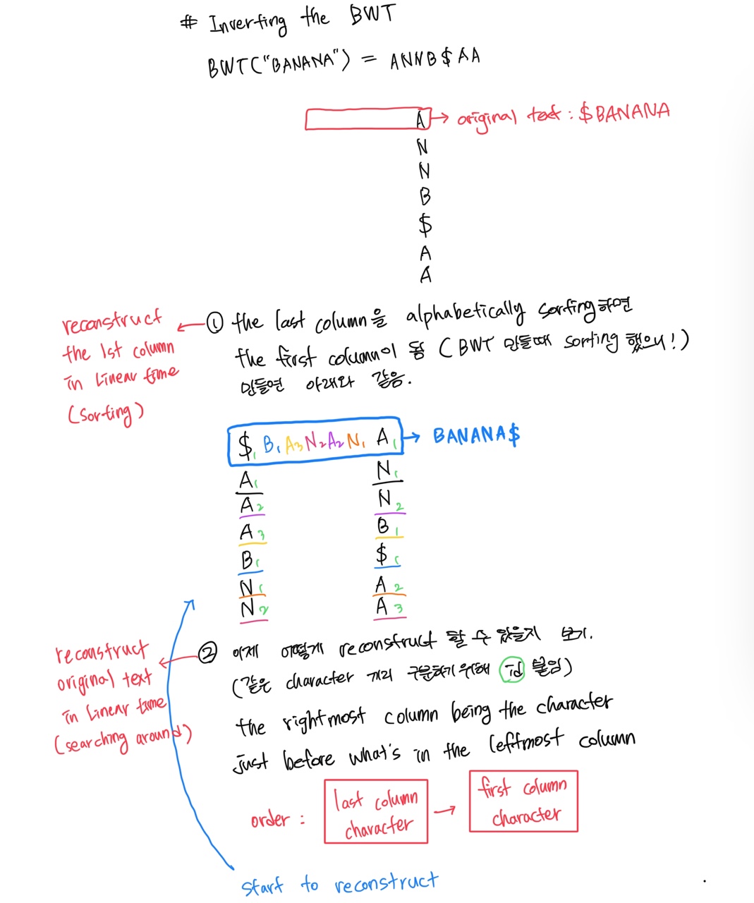 - 먼저 가장 첫 column을 reconstruct하기 위해서는 BWT column을 알파벳순으로 정렬하면 된다. 그림 ①설명