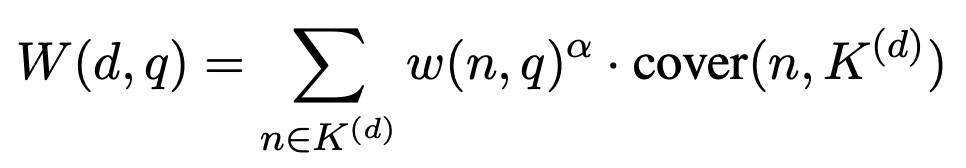 - cover(n, K)는 여러 유사한 ngram이 반복적으로 등장하는 문서에 대한 overscoring을 피하기 위한 weight이다.