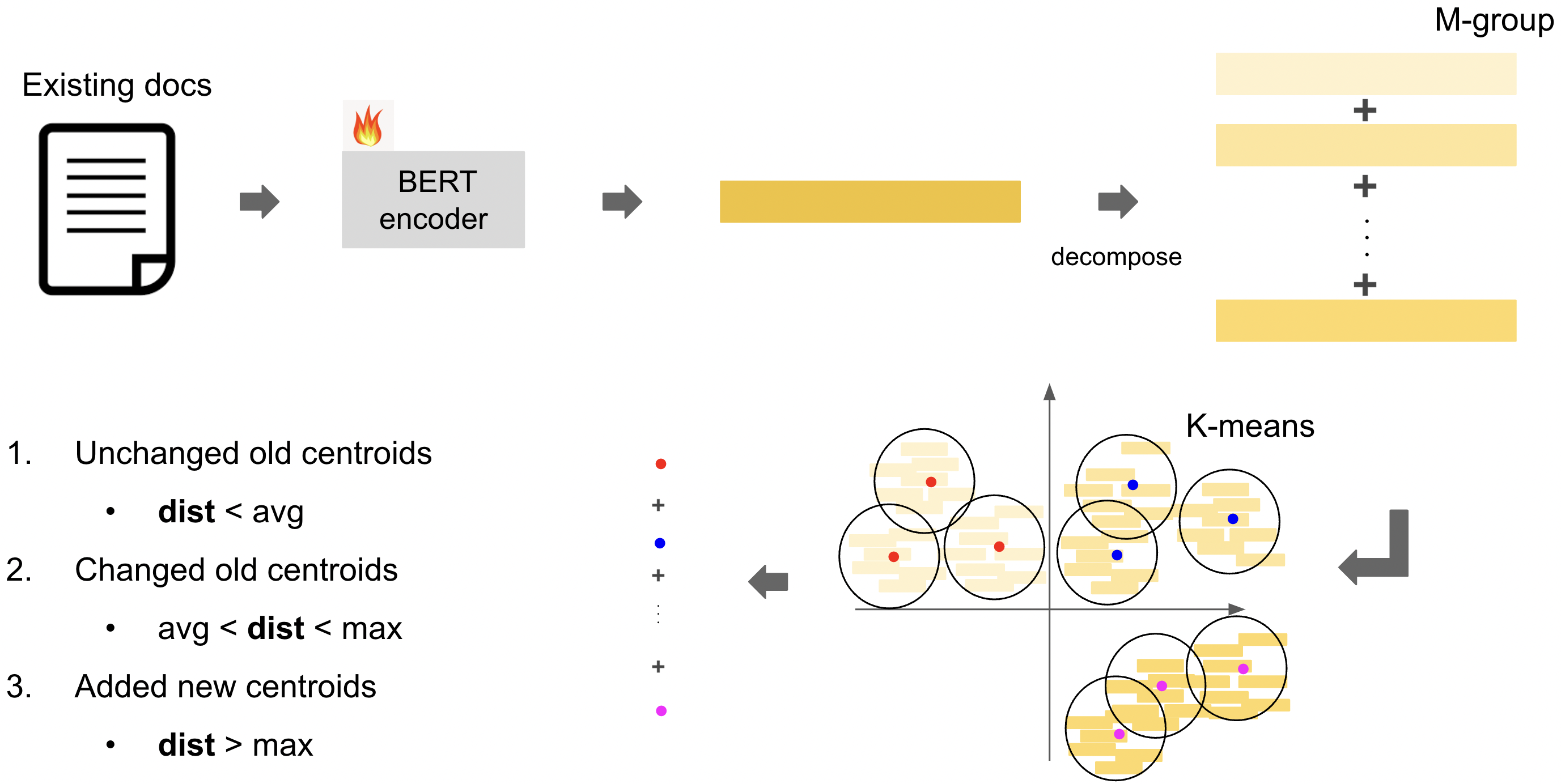 - we first divide the representation vector x 𝑡,𝑖 of each document 𝑑 𝑖 𝑡 ∈ D𝑡 , into 𝑀 sets of sub-vectors and add each sub-vector x 𝑡,𝑖 𝑚 to the corresponding 𝑚-th group. Then, for each sub-codebook, we compute the Euclidean distance between the newly arrived sub-vector x 𝑡,𝑖 𝑚 and its nearest centroid z 𝑡−1 𝑚,𝑘