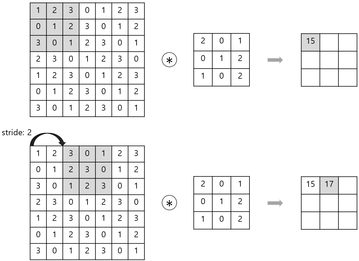 스트라이드(stride)는 보폭이란 의미로 필터를 적용하는 간격을 정한다.