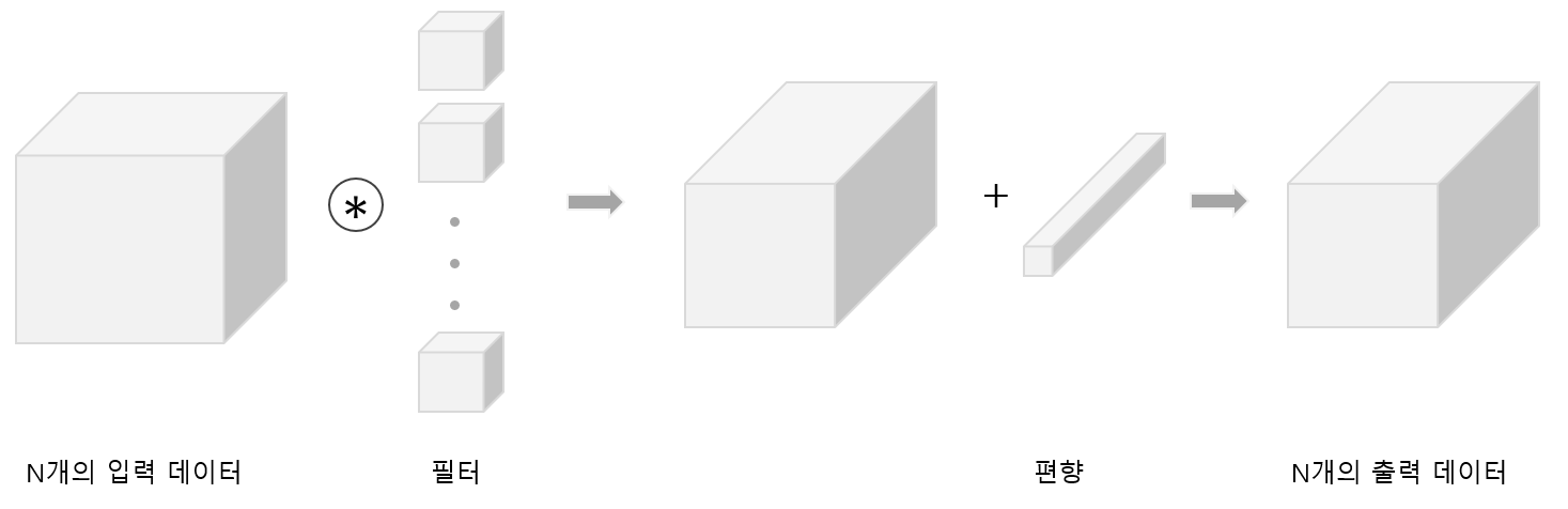 3차원의 데이터 N개로 구성된 4차원 형상을 가진 데이터를 input하여 한 번에 N개에 대한 합성곱 연산을 수행한다.