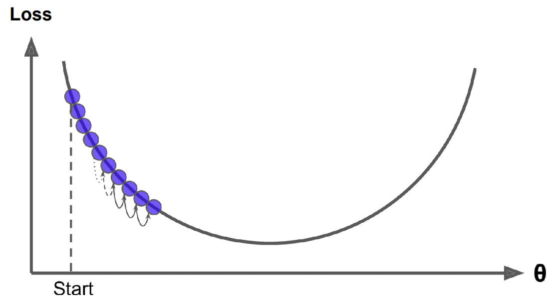 다시 생각해봐야할 것은 gradient라는게 weight 한 단위가 변할 때 loss에 대한 영향력을 나타낼 뿐, 그것이 극값의 위치에 도달할 수 있는 크기를 의미하지 않는다는 것이다. 아래 예시를 보자.