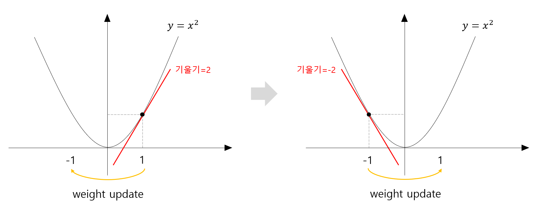 weight를 기울기만큼 이동하면 방향은 왼쪽으로 잘 가고 있지만 너무 많이 이동해서 계속 (1, 1)과 (-1, 1)로만 갱신되는 모습을 볼 수 있다. 즉, 기울기는 방향에 대한 정보는 잘 전달하지만 극값에 다가가기 위해 얼마나 이동해야하는 지에 대한 올바른 정보는 전달하지 못하는 것이다.