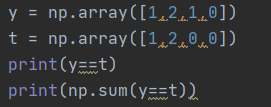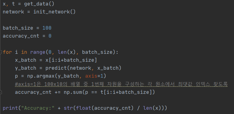 배치 단위로 분류한 결과를 실제 답과 비교하기 위해, ==연산자를 사용하여 넘파이 배열끼리 비교한다. True/ False로 구성된 bool배열을 만들고, 결과로 True의 개수를 센다.