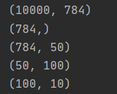784개의 원소로 구성된 1차원 배열이 입력되어 10개의 원소로 이루어진 1차원 배열이 출력된다. 이것은 이미지 1장을 입력했을 때의 흐름이다.