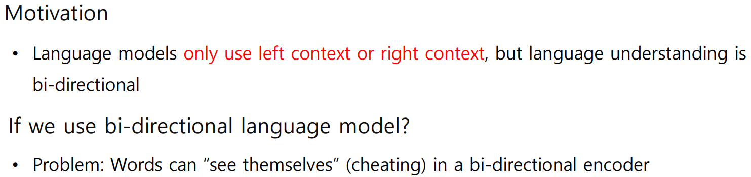 다음으로 BERT의 Motivaton을 살펴보자. GPT-1의 경우 <sos> I study 와 같이 <sos>토큰이 입력되면 I를 예측하고, I가 입력되면 study를 예측하는데, 이는 단어를 예측할 때 이전의 문맥만 고려하고 다음에 오는 단어들은 전혀 고려하지 않는다. 그러나 이전의 문맥을 놓치더라도 다음에 오는 문맥을 캐치하면 과거의 문맥을 추론할 수 있다.