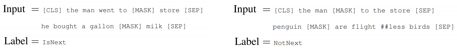 아래 그림처럼 두 문장이 있을 때, 각 문장 끝에 [SEP] token으로 문장을 구분하고 [CLS] token을 통해 이 문장이 연달아 와도 되는 문장인지 아닌지를 Binary-Classification한다. 두 문장이 인접하다면 IsNext라는 label로, 인접하지 않다면 NotNext로 분류된다.