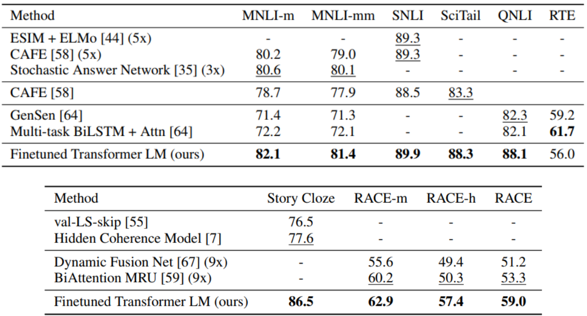 아래 그림은 수행하고자 하는 task만을 위한 customized모델과 self-supervised learning한 pre-training모델을 Transfer learning한 GPT-1모델을 비교하였을 때, GPT-1이 성능이 뛰어난 것을 보여주는 표이다.
