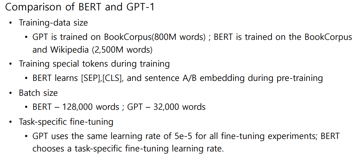 GPT-1과 BERT는 모두 Self-supervised Pre-training Model이다. 즉, label없이 self-supervised learning된 모델을 Transfering한 후, task에 맞게 Fine-tuning하기 위해 사용할 때의 그 pre- training model이다.