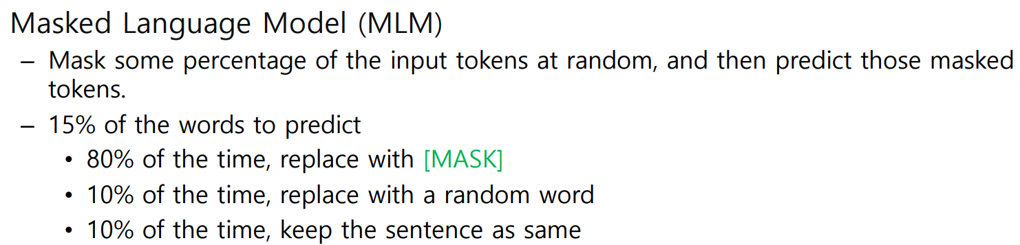 이러한 문제를 개선하기 위해 BERT는 Masked Language Model을 제안하였다. Transformer의 Encoder를 사용하면서 다음 단어를 예측하는 Language Model을 만들 수 있었던 이유가 바로 "Masked"이다. ★Encoder에 input을 넣을 때 부터 문장 내 15%의 token을 Mask처리한다. 이 15%의 token 중 80%는 [MASK] token으로 대체하고, 10%는 아무 단어로 대체하여 틀린 단어에 대해서 수정할 수 있도록 유도하였고, 나머지 10%는 원래의 정답 token으로 하여 맞는 단어에 대해 소신있게 유지할 수 있도록 하였다.