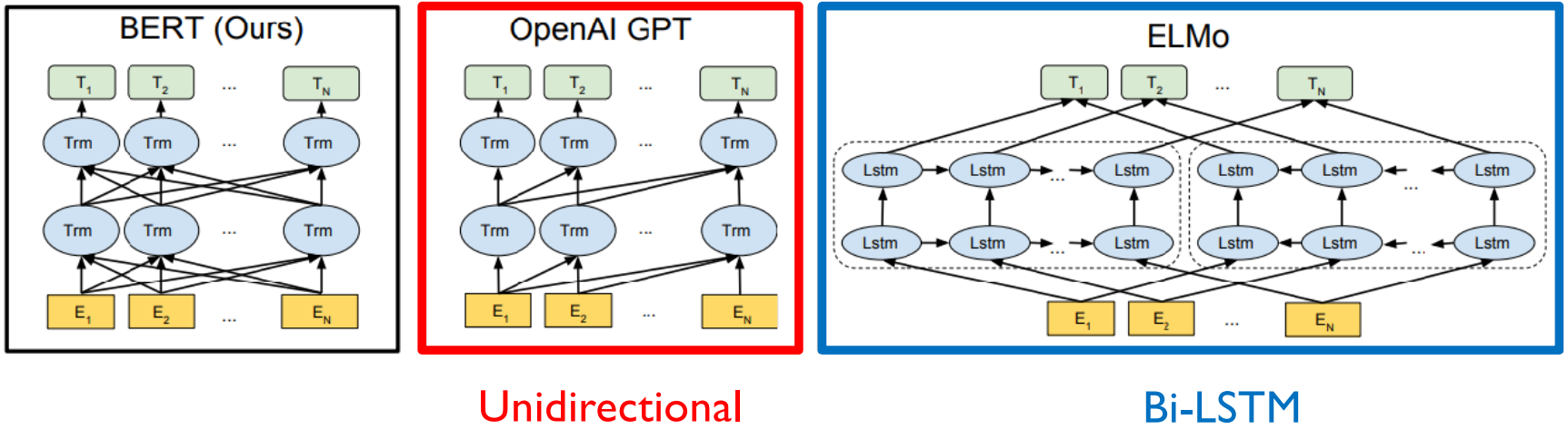 BERT와 GPT-1이 등장하기 전에, LSTM으로 다음 단어를 예측하는 language model이 있었는데, 아래 그림의 오른쪽에 있는 ELMo이다. 이후 LSTM의 encoding방식을 모두 Transformer의 방식으로 대체한 GPT-1과 BERT모델이 나와 많은 양의 데이터도 학습을 잘 할 수 있도록 발전되었다.
