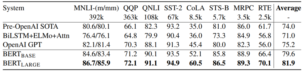 NLP관련 여러가지 task를 수행했을 때 BERT가 뛰어난 성능을 보였다. 참고로 여러가지 task를 모아놓은 benchmark dataset을 GLUE라고 한다.
