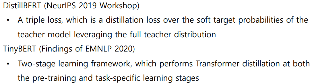 • TinyBERT: Distilling BERT for Natural Language Understanding, Findings of EMNLP’20 https://arxiv.org/abs/1909.10351