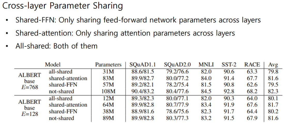 Parameter수가 가장 작은 All-shared를 보면, 기존의 BERT모델(=Not-shared)과 비교 했을 때 Parameter수는 대폭 줄었지만 성능의 하락폭은 작았다.