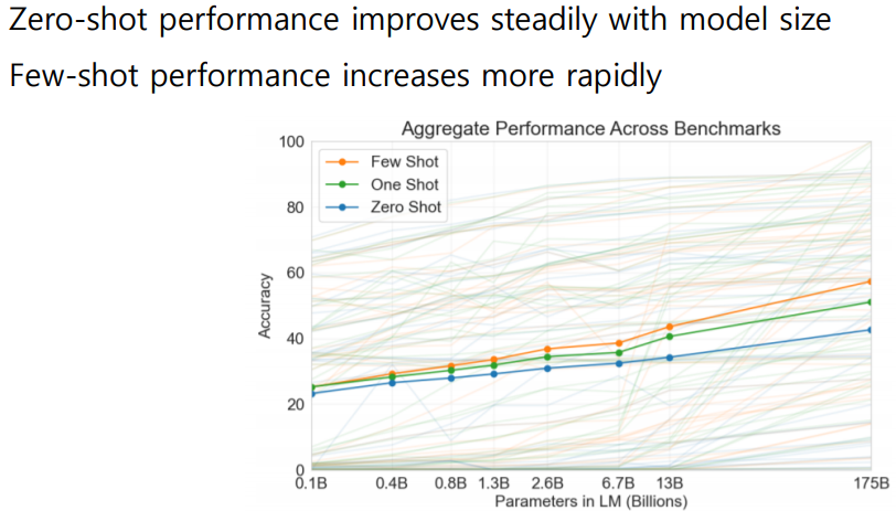 아래 그래프를 보면 Dawn stream tasks in Zero/One/Few-shot setting은 모델 사이즈가 클 수록(=Parameter수가 많을 수록) 더 좋은 성능을 내는 것을 확인할 수 있다.