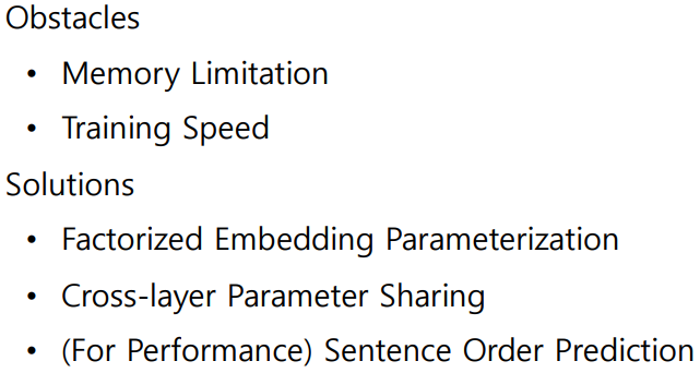 기존의 NLP모델은 점점 큰 모델과 많은 parameter를 사용하여 성능을 향상시켜왔는데, 이는 메모리와 시간 자원을 많이 필요로 한다. ALBERT는 parameter수를 줄여 모델을 경량화하면서도 좋은 성능을 유지 및 향상하였다.