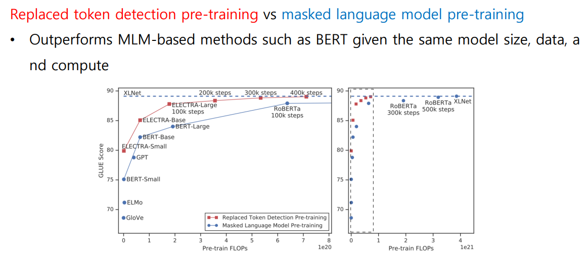 MLM과 ELECTRA의 비교 실험 결과는 아래 그림과 같다. MLM은 연산이 증가할 수록 좋은 성능을 보인다. ELECTRA는 모든 경우 MLM의 성능을 능가하였다.