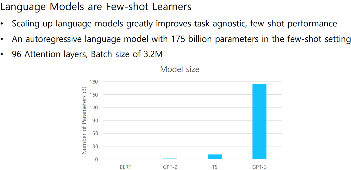 GPT-3은 GPT-2를 발전시킨 모델로 구조에 변화는 주지 않았지만, 더 많은 데이터를 사용하였으며 Self-Attention Layer를 많이 쌓아 parameter수를 대폭 늘림으로써 높은 성능을 달성했다.