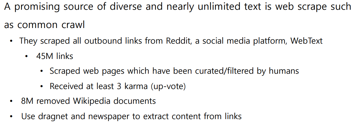 양질의 데이터셋을 확보하기 위해 Reddit이라는 질의응답 플랫폼에서 답변에 포함된 링크 중 좋아요를 3개 이상받은 데이터 등을 가져왔다.
