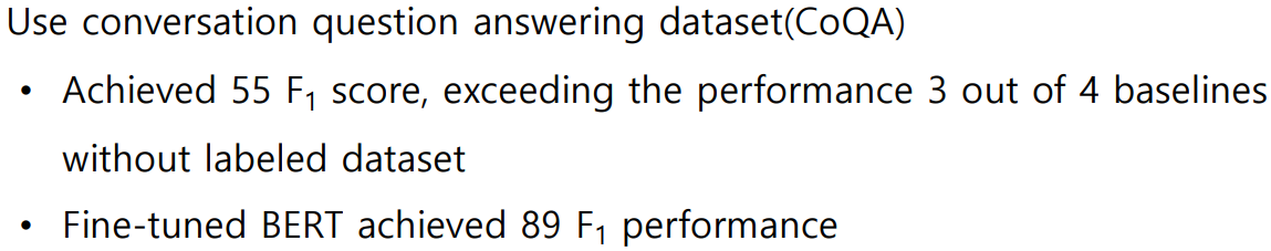 GPT-2의 LM은 Zero-shot setting으로 down stream task를 수행할 수 있다고 하였다. 따라서 어떠한 fine-tuning없이 CoQA데이터셋을 학습하는 실험을 하였는데, 그 결과 F1 score55의 성능을 보였다. Fine-tuning을 했을 때 F1 score89를 달성했지만, Zero-shot setting에서도 55%의 괜찮은 수행 결과를 내었다.