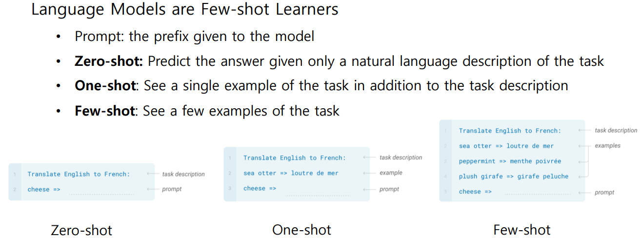 GPT-3는 GPT-2의 Down-stream tasks in Zero-shot setting의 가능성을 보고 Few-shot setting으로 발전시켜 fine-tuning 없이도 좋은 성능을 낼 수 있도록 하였다.